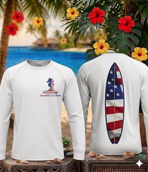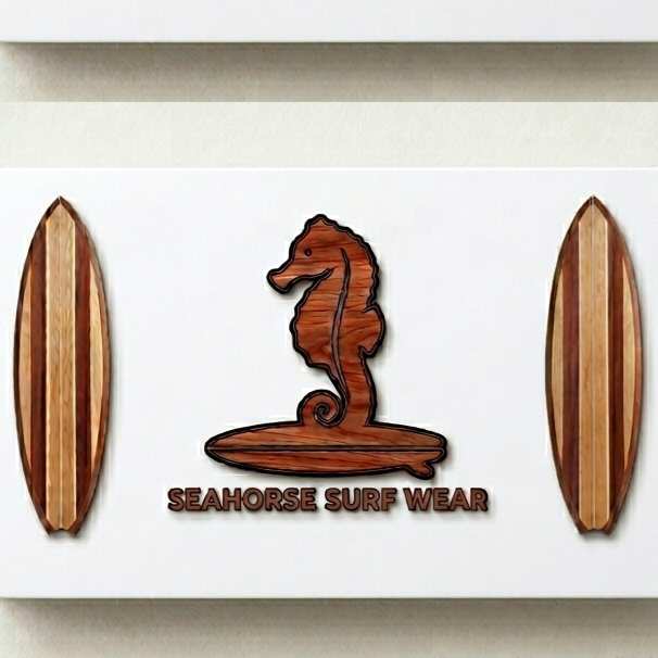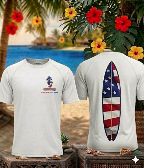 A 15 1/2 inch long surf board to a pointed top surf board to a 5 inch in width at center of surf board to a 1 1/4 inch in width at bottom of surf board. A 4 inch by 4 inch front left side chest logo.